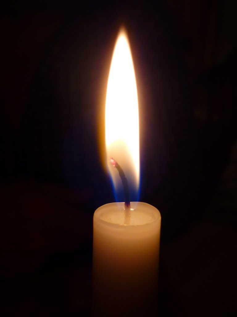 One flame. No scent in spite of the box description. No one around to comment, criticize, weigh or measure my kitchen flame or my momentary thoughts. Watching the heat-filled wax build up now so it doesn’t triumph.